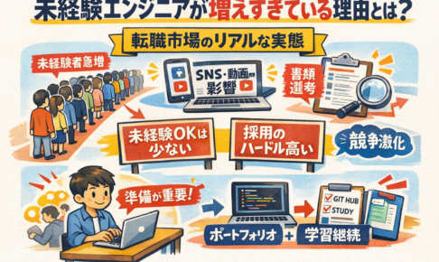 未分類 未経験エンジニアが増えすぎている理由とは?転職市場のリアルな実態 2025.12.18 syuweb 「未経験エンジニアが増えすぎて、もう転職できないのでは?」と不安になる人は少なくありません。SNSや動画で成功…